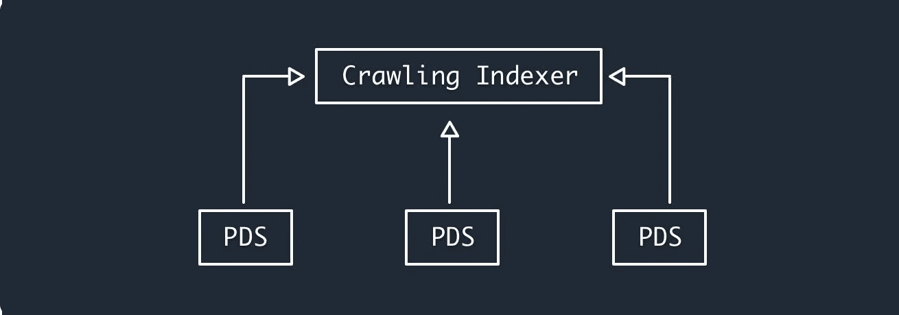 The AT Protocol is architected in a “big world with small world fallbacks” way, modeled after the open web itself. With the web, individual computers upload content to the network, and then all of that content is then broadcasted back to other computers. Similarly, with the AT Protocol, we're sending messages to a much smaller number of big aggregators, which then broadcast that data to personal data servers across the network.